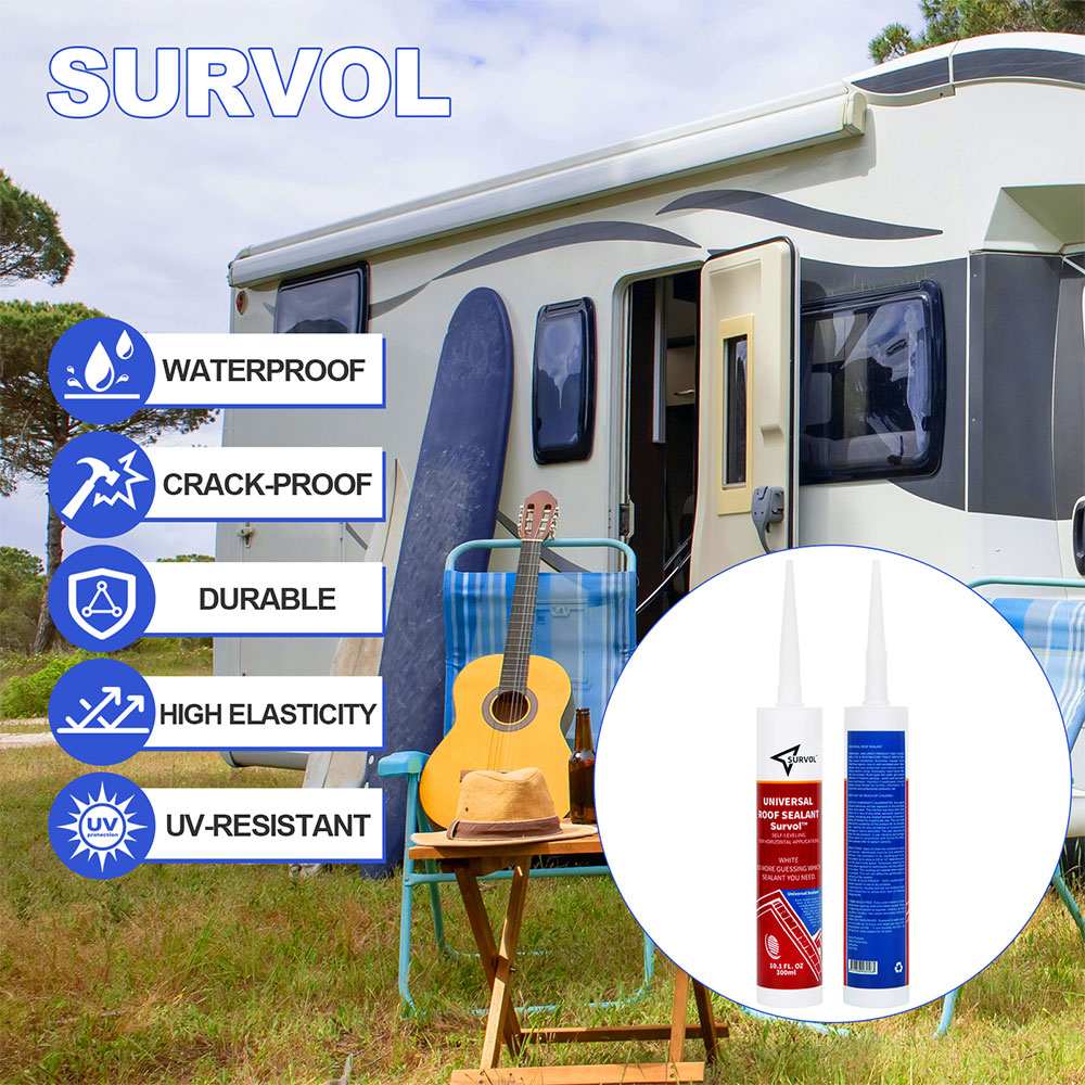 Survol Roof Repair Self-Leveling Lap Sealant creates a secure, strong seal with the RV roof’s edges, air vents and vent pipes, etc.